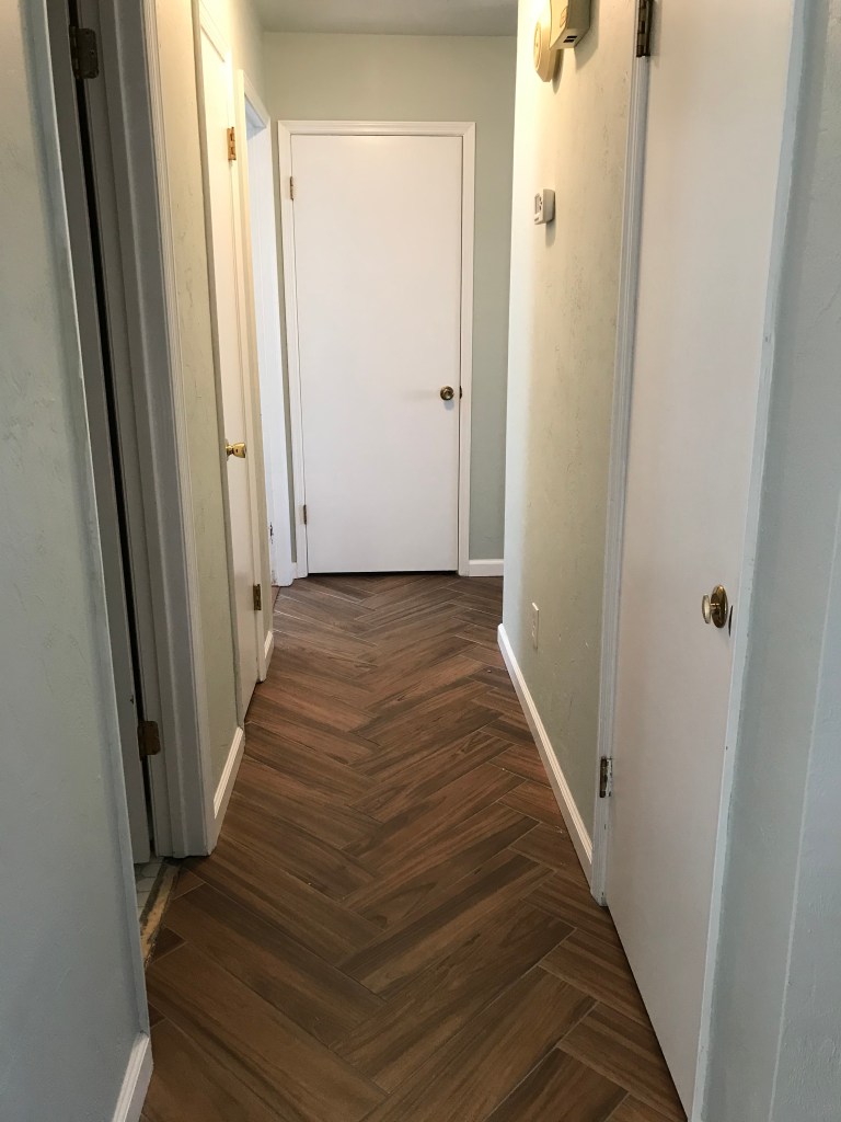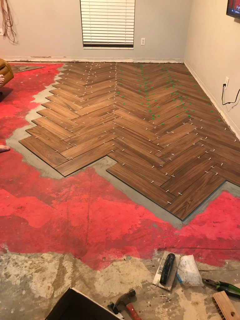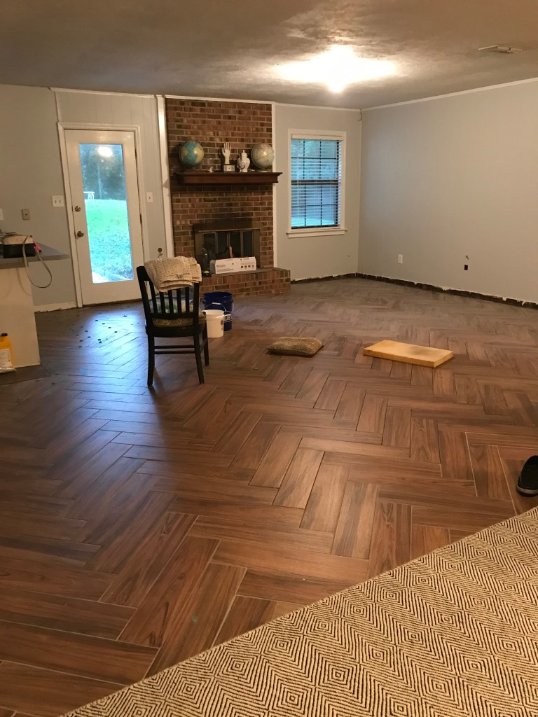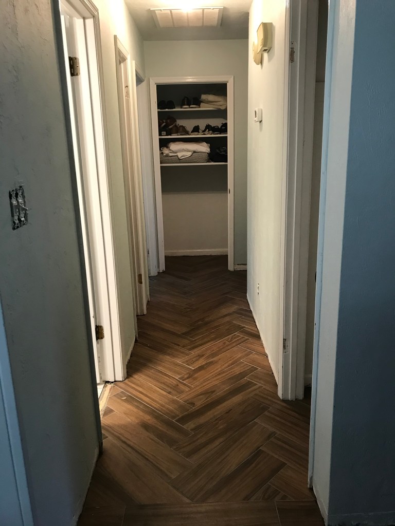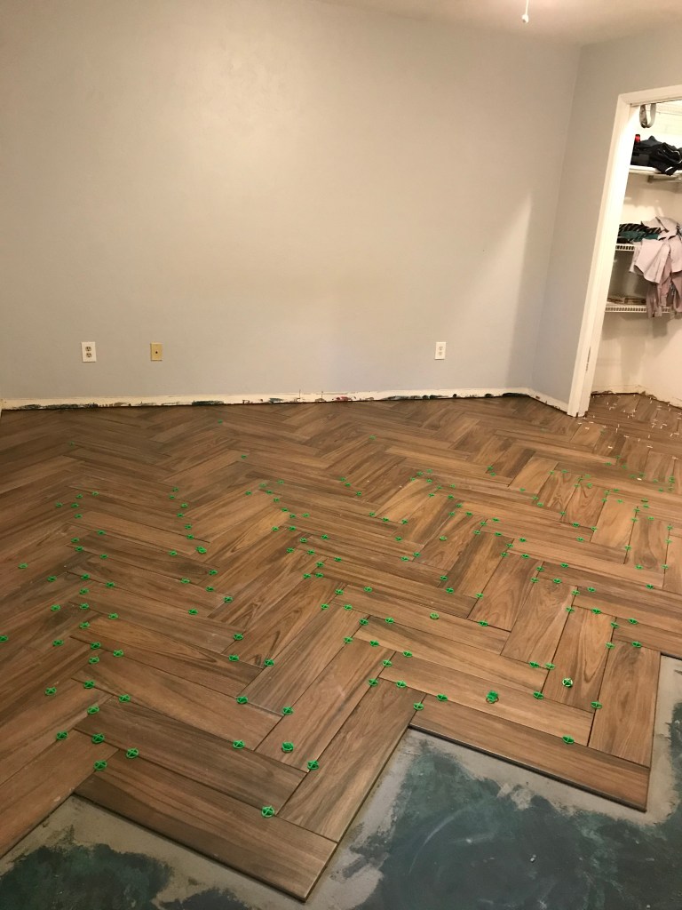 We were so over doing the herringbone pattern throughout the house that we laid an off-set patterned floor (kinda like subway tile) in the guest bedrooms.