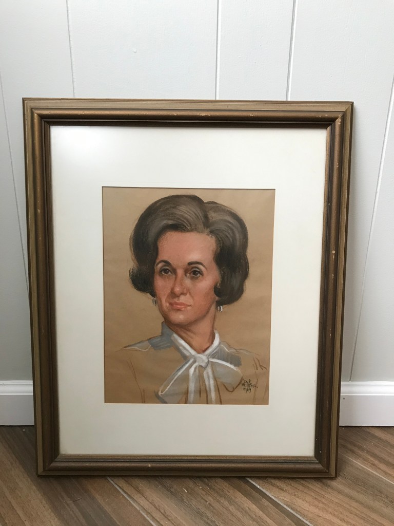 While in Atlanta, I think I found my favorite store EVER, Kudzu. It’s a combination of antiques/vintage finds/and new items that have a vintage flair. I bought another portrait there, Denise. Denise was in rough shape when we bought her but after watching a few episodes of Repair Shop on Netflix Adam decided he could fix her up. Apparently saliva is the best way to remove dirt and dust from a painting. Also, Denise was sliding down the canvas because of how it was attached to the frame. Adam took everything apart and rebuilt the frame and now Denise is as good as new.