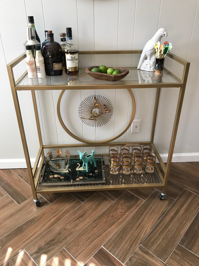 Here is the final product of our bar cart (below). Ok, I have to brag about this…see the brass birds in the circle section of the bar cart below? That is not part of the bar cart, I had that decorative object and thought it would give the bar cart a mid-century look. I absolutely love how it turned out. I bought the white parrot at a Goodwill for $2. Also, you’ll notice a tiny part of my drink stirrer collection. On the bottom shelf of the bar cart is a set of mid century glasses we bought in Birmingham and an ice bucket, ceramic deer, and swan serving tray I bought at an antique store in Dothan, Alabama…crazy! Oh, and I paid $90 for the bar cart I found on Facebook Marketplace.